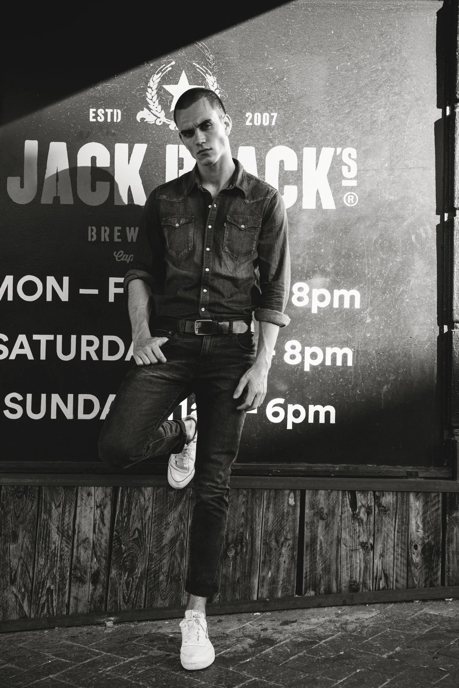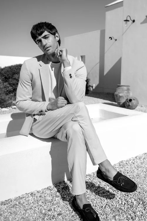 A timeless silhouette stands stark against the rustic backdrop of modern architecture in muted tones. This black-and-white editorial channels refined masculinity with tailored precision. Clean lines and contemplative gazes create a story of quiet confidence, set in a minimalist oasis.